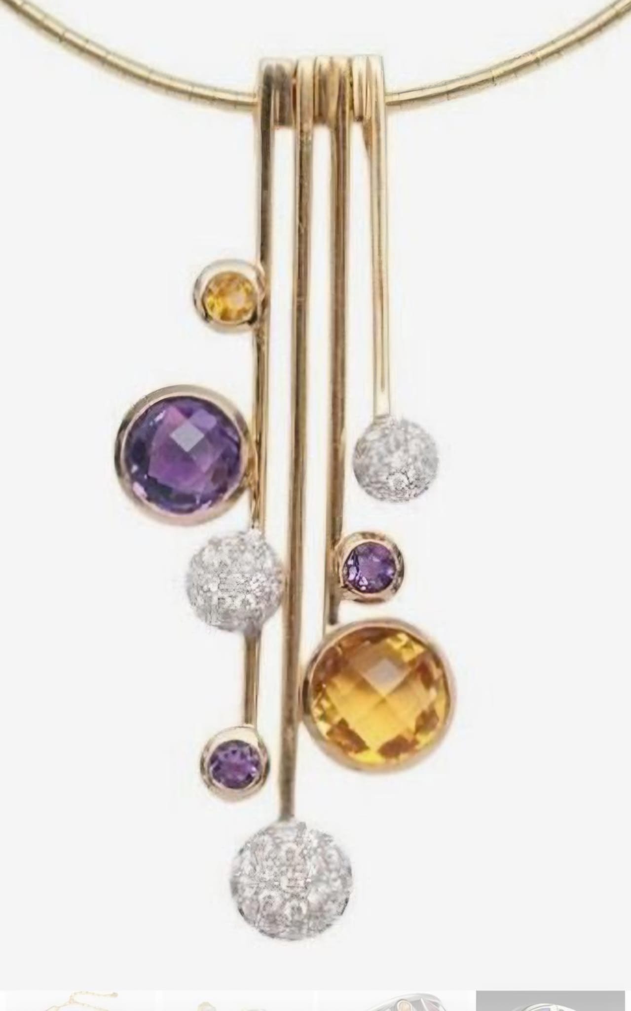 Nowoczesny naszyjnik o awangardowej formie, łączący pionowe złote elementy z naturalnym blaskiem kolorowych kamieni. Harmonijna kompozycja fioletowych i miodowych odcieni w połączeniu z fakturowanymi kulami tworzy efektowną, przestrzenną biżuterię. To idealny wybór dla osób szukających unikalnych, artystycznych form, które nadają stylizacji luksusowego i nowoczesnego charakteru.